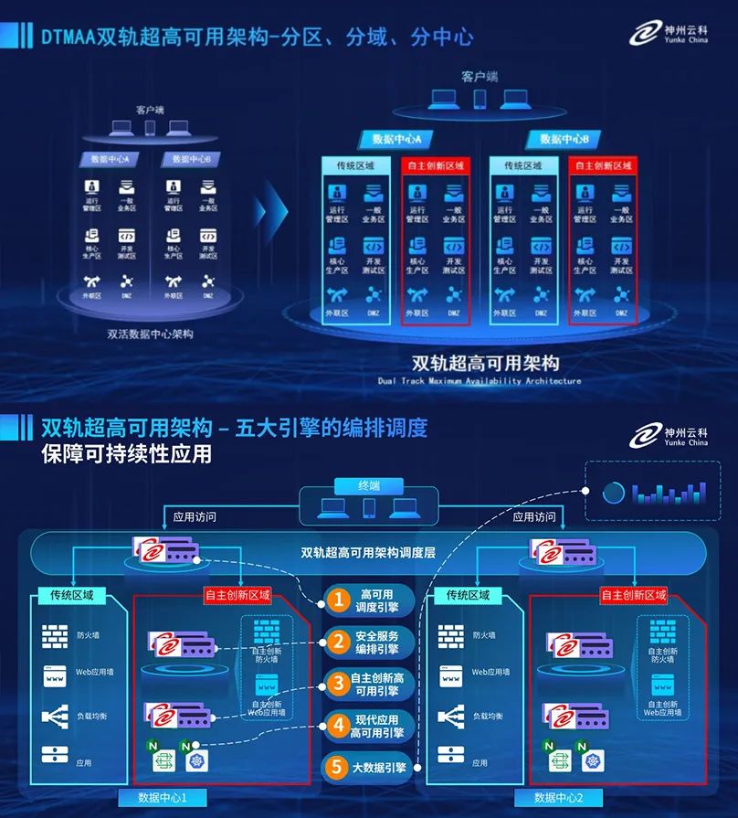 为助力银行业务高质量发展,更好地应对数字经济时代对可持续性的高要求,实现“信创”与“数字化”齐头并进,3044永利集团创新性的推出了双轨超高可用架构。该架构在双活数据中心的分区调度基础上,增加信创域和非信创域的分域调度,实行信创域与传统域应用全量部署,使双中心运营变为双中心四区域并行运行,互为多活,将“0到1”的单轨建设道路变为分区分域协同的多活双轨超高可用架构。帮助客户在新架构下,保障“信创”的同时解决性能瓶颈,提升稳定性,保证应用可持续性,最终实现信创区域和非信创区域的平滑过渡,完成国产化替代目标。
